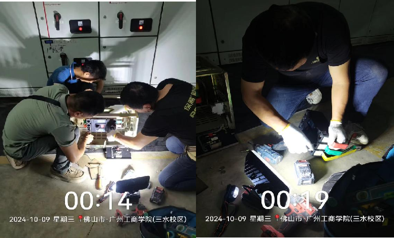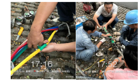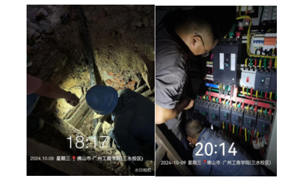 后勤处于当天下午请三水区供电局携带专业检测设备前来检测。检测后,发现在电缆的60米位置出现故障点,系由前段时间高温期间用电负荷大,电缆持续发热,同时近期天气转凉,用电负荷骤减,热胀冷缩,使电缆出现了内部绝缘损坏的情况。经当天下午紧急修复,于10月9日晚上20:42恢复了三水校区学生活动中心的正常供电。
