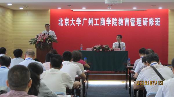 北京大学教务部副部长、元培学院副院长卢晓东教授对大家表示诚挚问候和热烈欢迎。他介绍了北大的历史沿革,兼容并包,开一代风气之先;风雨兼程,117年薪火相传。为使大家有更好的学习效果,他提出两点建议:一是空去自己,空杯充盈。二是努力提问,生成意义。面对外部环境和教育对象的变化,让思维的火花生根发芽,在北大的独特、深厚的人文环境中,交流、探讨、总结,充实思想,继而提升,留下闪光印记;将所得所悟应用到工作单位的教育教学中,为广东乃至世界培养优秀毕业生。