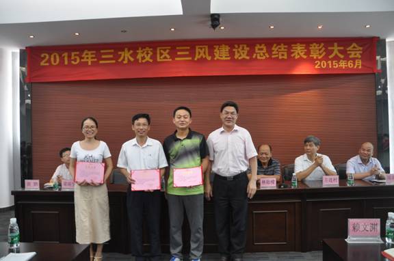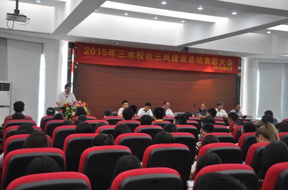 【本网讯】6月25日下午,三水校区在办公楼三楼学术报告厅举行2014—2015学年第二学期“三风”建设活动月总结表彰大会。学院副院长吴宏岳,校区管委会主任何国林,学院终身名誉顾问林贻樑,院党委副书记、学生处处长黄鹏,电子信息工程系主任梁瑞生,物流与公共事务管理系主任左连村,创业培训学院院长陈礼富,校区全体辅导员、行政秘书以及来自各系的师生代表共200多人参加了大会。大会由何国林主任主持。