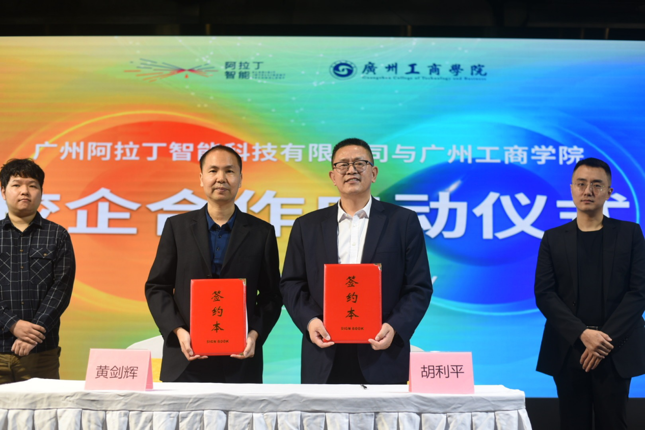 在“校企合作启动仪式”上,副校长胡利平、广州阿拉丁智能科技有限公司合伙人黄剑辉分别代表学校和企业方致辞,并在启动仪式上签署了校企合作协议。