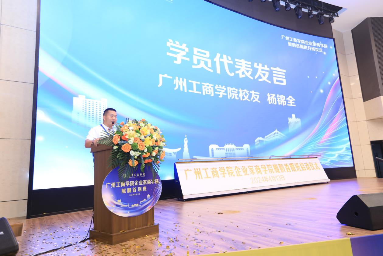 广州北晟新材料科技有限公司总经理杨锦全校友作为学员代表发言,他分享了自己选择企业家商学院继续学习的原因,并强调了在当下日新月异的时代,不断学习、充实知识体系的重要性,总结了三点与同学共勉的学习之道:一是要持续奋进,不满足于现状,勇攀高峰。二是将理论知识与实践相结合,通过实践来深化对知识的理解。三是要培养战略眼光和全局观念,从宏观角度看待问题,把握机遇。