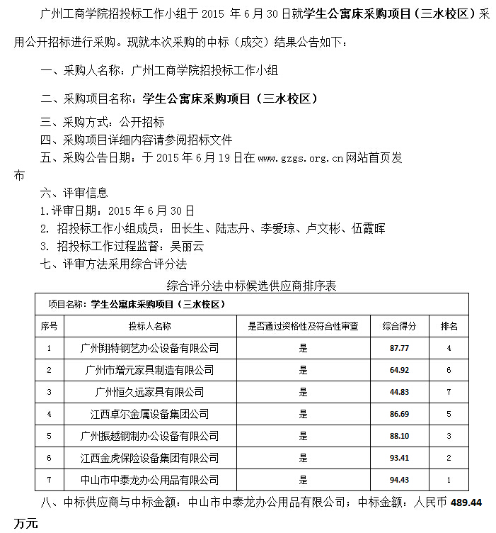学生公寓床采购项目(三水校区)中标公告
