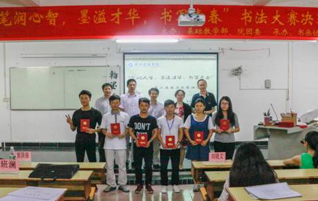 【本网讯】5月27日下午,由学院基础教学部主办,团委社团联合会书画协会承办的“笔润心智,墨溢才华,书写青春”第二届书法大赛决赛在学院花都校区教学楼417室举行。广州市书法协会理事、花都区书法家协会主席黄国强、学院书画院班澜教授、以及黄主席团队的陈可坚老师、尹哲东老师担任本次书法大赛决赛的评委,学院基础教学部主任刘晓文教授为决赛致辞。