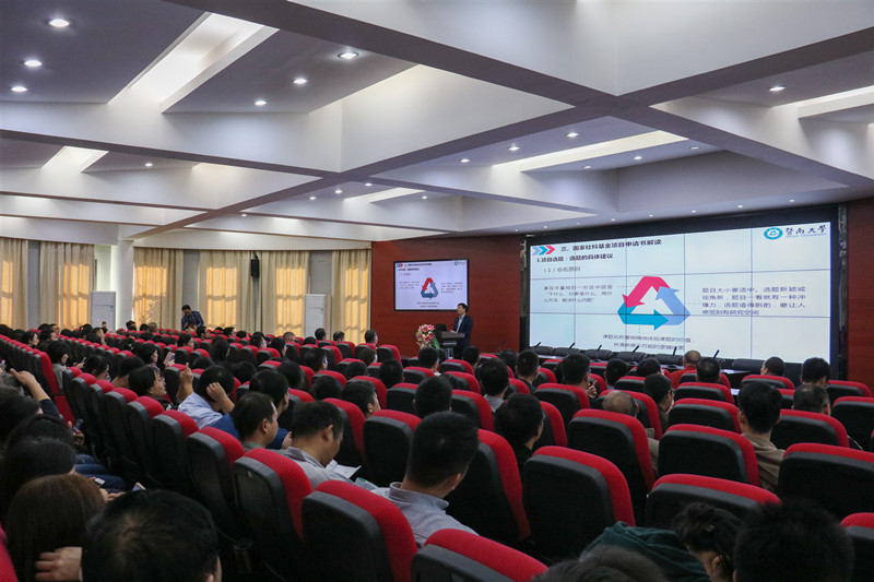 潘启亮处长首先介绍了国家社科基金项目的类型以及申报时间,并着重指出各个项目的申报特点、难点和竞争强度。接着,潘处长从思想正确、顶天立地、兼顾特长、注重创新、难度适中等方面重点阐述了项目选题的整体要求。随后,潘处长结合自己多年的实践经验,提出了选题的具体建议,一是课题名称要明确地体现课题的价值并清晰展示可能的逻辑线索;二是要多次、反复、逐字推敲课题名称;三是课题名称避免存在语义歧义、过于冗长或简短等问题;四是征求专家或同事的意见,检验课题名称是否合理或恰当。最后,潘处长还通过案例来分析如何填写选题依据、研究内容、思路方法、创新之处、预期成果等内容。