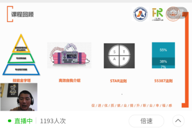 本次讲座由美好生涯学院青少年生涯事业部总监、美国国家生涯协会认证生涯咨询师高松亭老师主讲,499名应届毕业生参加了讲座。讲座过程中,高老师用身边真实生动的案例和风趣幽默的语言为同学们讲授了面试的核心内容、识别岗位胜任力要求、面试环节准备、云面试技巧等内容,也重点为同学们剖析了“技能金字塔”“高效自我介绍”“STAR法则”“55387法则”,高老师还时不时与同学们互动,整个直播过程气氛活跃,沟通顺畅。讲座最后,高老师为同学们准备了答疑环节,同学们纷纷提出求职中遇到的问题与困惑,高老师一一耐心解答。