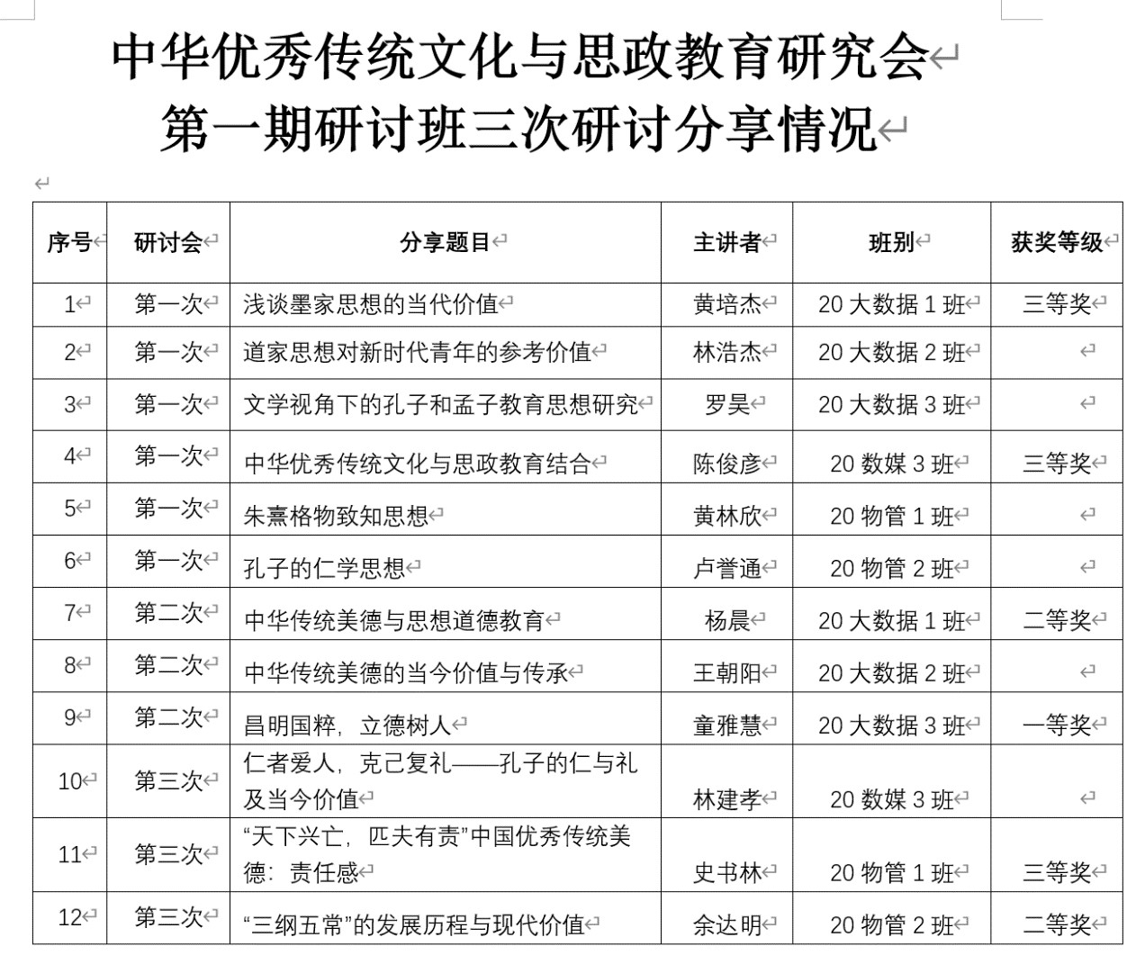 通过本学期“中华优秀传统与思政教育研究会”的研讨,第一批会员们深感获益匪浅,并有了三点共识:一是中华传统优秀文化是一个宝库,值得我们深入学习挖掘,以此来丰富学习资源,充实大脑,滋润心灵;二是对中华优秀传统文化一定要历史辩证地理解,要站在当时的历史环境条件理解它存在的合理性和对当时社会所发挥的调适矛盾、稳定社会的作用;三是对中华优秀传统文化要创造性转化和创新性发展。(马克思主义学院)