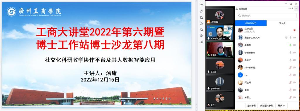 本次活动由博士工作站主办、工学院承办,活动邀请华南师范大学学术委员会副主任、教学指导委主任、学者网创始人汤庸教授进行“社交化科研教学协作平台及其大数据智能应用”为主题的线上讲座,170多位博士及感兴趣的老师、学校联合培养研究生通过线上收看。活动由易露霞教授主持。