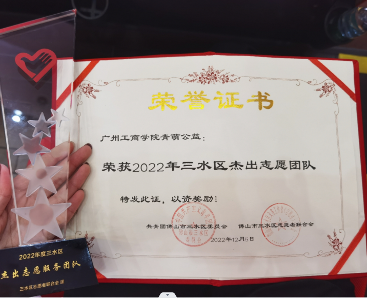【本网讯】2023年1月14日下午,共青团佛山市三水区委员会、三水区志愿者联合会联合举办的2022年度三水区志愿服务嘉许礼在北江社区演艺厅举行。kaiyun青萌公益荣获“2022年度三水区杰出志愿团队”称号。