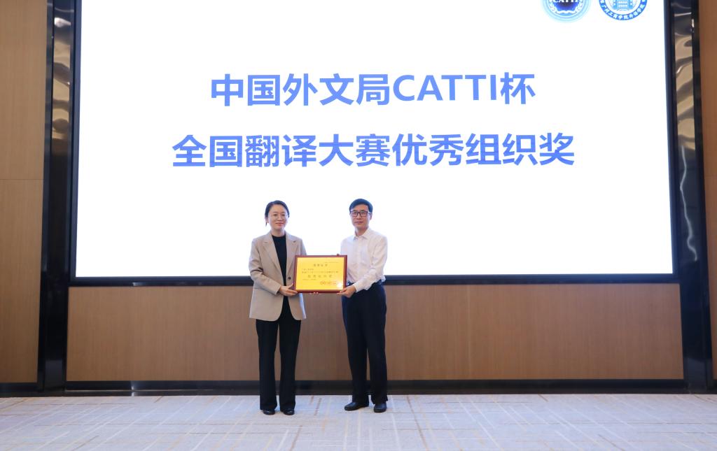 考试项目中心副主任冯婧一向外语学院刘沛富院长颁发“2022年CATTI杯全国翻译大赛优秀组织奖”。