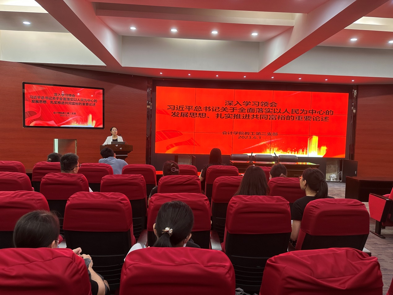 【本网讯】治国之道,富民为始。为加强党员同志对共同富裕的理解,牢固树立以人民为中心意识,不断推动学习贯彻习近平新时代中国特色社会主义思想主题教育走深走实,6月1日,会计学院教工第二党支部全体党员、教师代表在办公楼322报告厅集中学习习近平总书记关于全面落实以人民为中心的发展思想、扎实推进共同富裕的重要论述,并交流学习心得。学习会由支部书记周福萍主持。