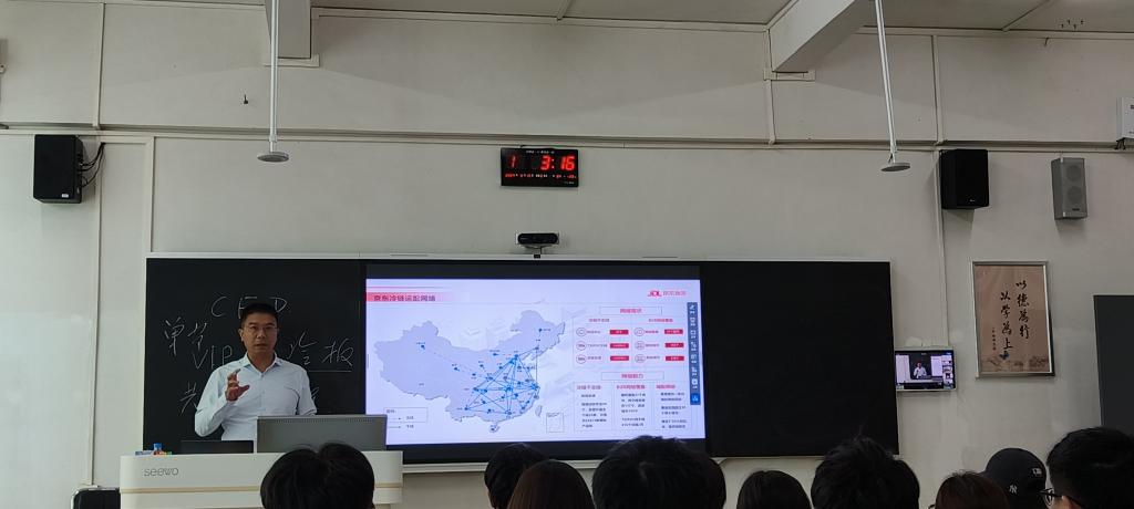 【本网讯】5月15日,产业学院举办观摩示范课,京东物流集团物流科技事业部汪鑫文副总监和中顺鹏升物流集团周运鹏董事长应邀进校,共同为2022级智慧冷链物流班讲授《冷链物流概论》,产业学院全体老师参加观摩。