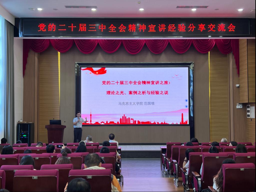 会议伊始,马克思主义学院党总支副书记谭丽婷老师对本次分享交流会作了简要介绍。她指出,学习贯彻党的二十届三中全会精神是当前和今后一个时期全党全国的一项重大政治任务,作为马克思主义学院的教师,我们不仅要深入学习全会精神,更要广泛宣传、坚决贯彻,以实际行动确保全会精神落地生根。在随后的专家宣讲环节中,朱青山副教授、范国增副教授及贾岚教授分别就其在宣讲实践中的经验和心得进行了深入分享。
