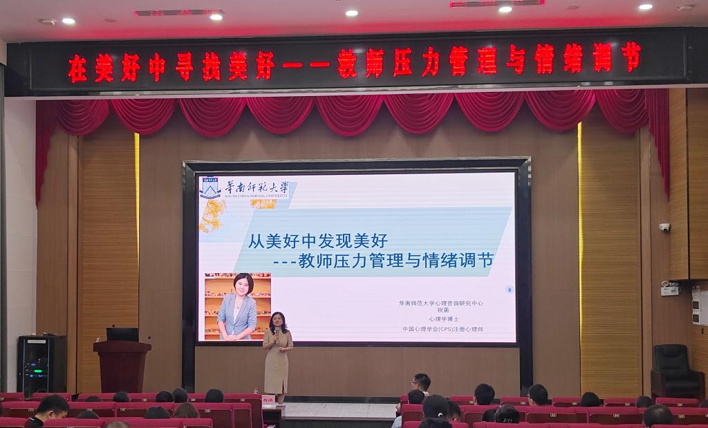 【本网讯】为助力教师们更好地应对工作中的身心负荷,提升心理健康水平,4月24日下午,学校在花都校区为教师们举办专题讲座,华南师范大学心理学专家祝菡博士主讲教师压力管理与情绪调节。全校150多名教职工参加,开启了一场关于压力管理、情绪调节和教育本质的深度对话。讲座由教师工作部副部长黄国威主持。