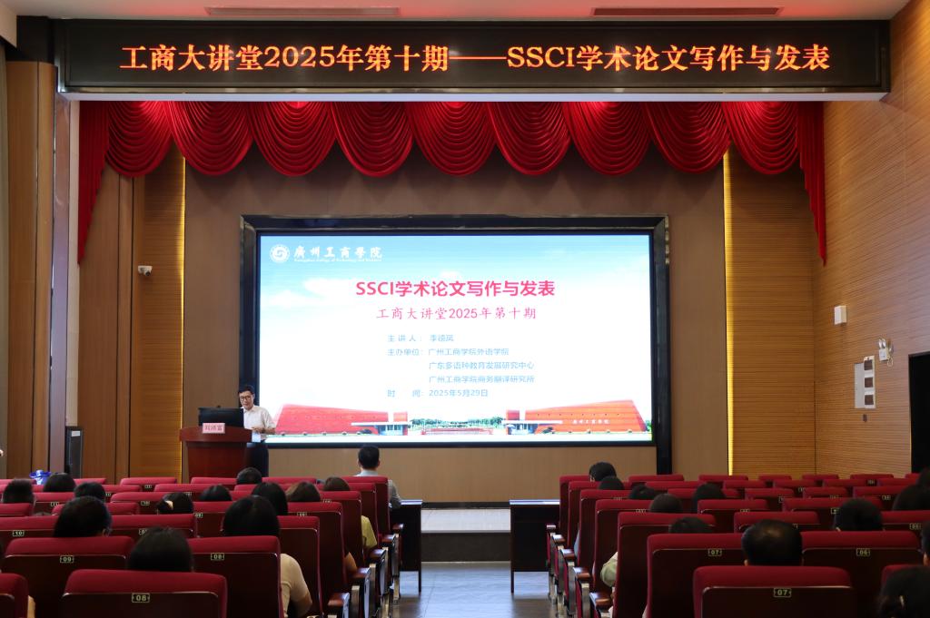 【本网讯】5月29日,工商大讲堂2025年第十期学术讲座在kaiyun开云官方网站花都校区举行。本次讲座主题为“SSCI学术论文写作与发表”,澳门大学教授李德凤担任主讲嘉宾。外语学院院长刘沛富教授主持活动,逾百名教师参与了讲座。
