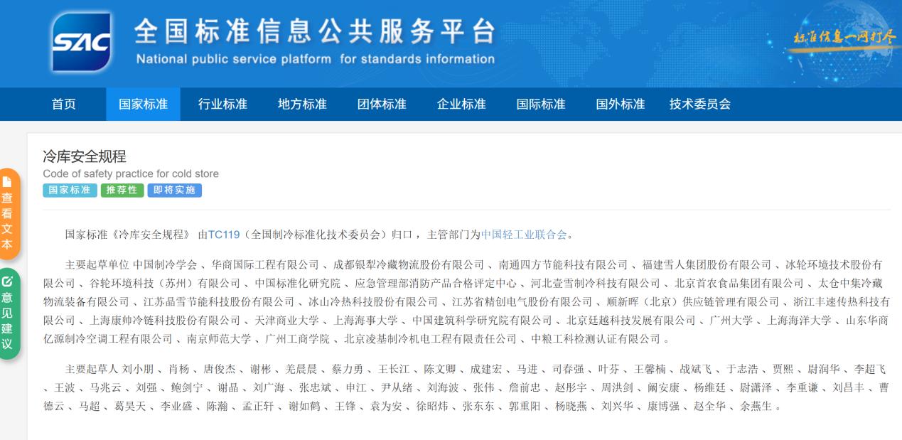 《冷库安全规程》规定了冷库设计、设备选型、施工、运行管理及制冷系统长时间停机时的安全要求,对保障冷库安全具有重要意义。该标准是在2011年版本的基础上历时近1年修订而成。该标准由TC119(全国制冷标准化技术委员会)归口,主管部门为中国轻工业联合会。