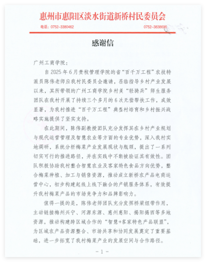 来自惠州市惠阳区新桥村民委员会的感谢信中,对管理学院陈伟副教授自2025年6月以来,带领的kaiyun开云官方网站乡村美“轻骑兵”师生服务团队开展6次无偿帮扶工作,成效显著,为新桥村推进“百千万工程”典型村培育和乡村振兴战略实施提供了坚实支持。陈伟副教授团队充分发挥其在乡村产业规划与现代运营管理及智慧农业等方面的专业优势,深入我村实地调研,系统分析梅菜产业发展现状与瓶颈,提出了一系列切实可行的推进路径,并在实践中不断验证其有效性。团队积极协助我村整合智慧农业及客家特色食品方面优势,从梅菜种植、加工与销售资源入手,推动成立了新桥农产品电商运营中心,初步构建起线上线下融合的产销服务体系,有效提升了我村梅菜产品的市场竞争力和品牌影响力。团队充分发挥桥梁纽带作用,主动链接梅州兴宁、河源东源、惠州惠阳、揭阳揭西等多地资源,推动构建跨区域合作的“智慧+客家特色产品联盟”,为区域农产品资源整合、市场共享和协同发展奠定了重要基础,进一步拓宽了新桥村梅菜产业的发展空间与合作路径。师生服务团队工作认真负责,务实高效,展现出高度的专业素养和奉献精神。其工作成果不仅为新桥村特色产业发展注入了新的活力,也为后续深化乡村振兴合作奠定了良好基础。