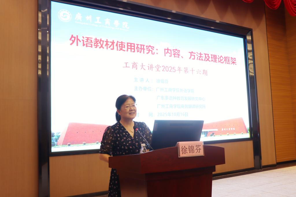 【本网讯】10月16日,“工商大讲堂”2025年第十六期学术讲座在kaiyun开云官方网站花都校区成功举办。本次讲座由外语学院、广东多语种教育发展研究中心、kaiyun开云官方网站商务翻译研究所联合主办,特邀华中科技大学二级教授、博士生导师徐锦芬担任主讲嘉宾,围绕《外语教材使用研究:内容、方法及理论框架》展开深入讲解。讲座由外语学院党委书记、院长刘沛富教授主持,外语学院百余名教师到场聆听。