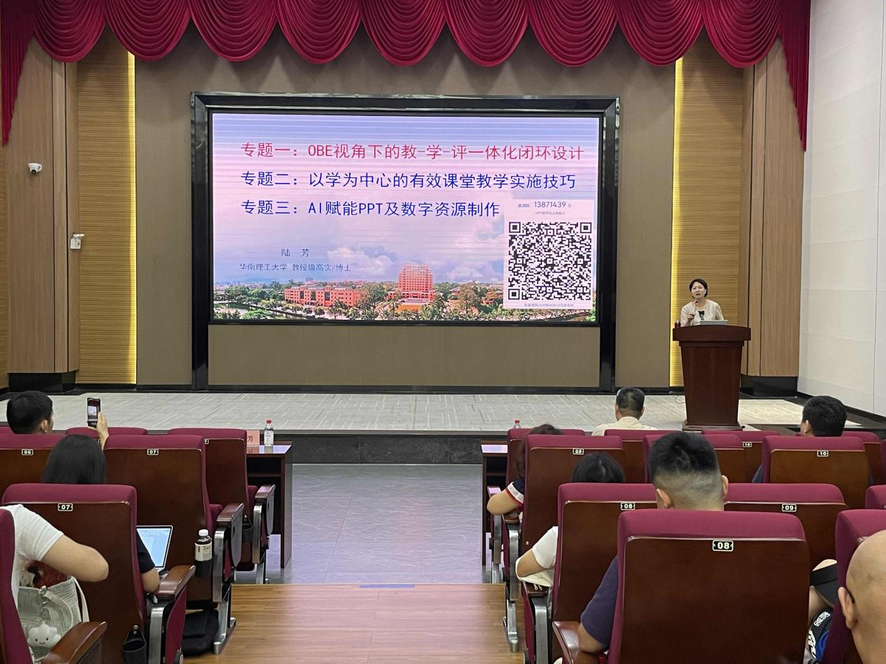 【本网讯】10月18日,学校在花都校区举办新教师基本教学能力提升专题培训。特邀华南理工大学陆芳教授主讲,聚焦新教师教学能力核心要素,系统讲授了“OBE视角下教-学-评一体化设计”“以学生为中心的有效课堂教学实施技巧”及“AI赋能PPT及数字资源制作”,为新入职的专任教师提供了专业指导。