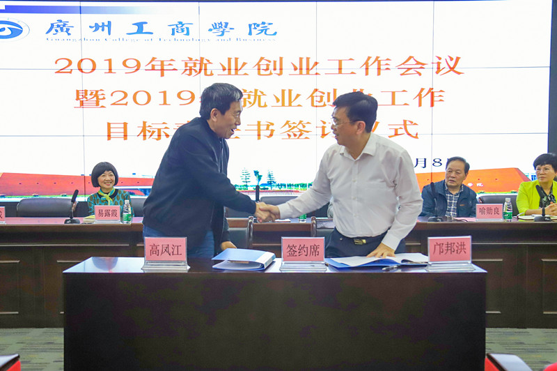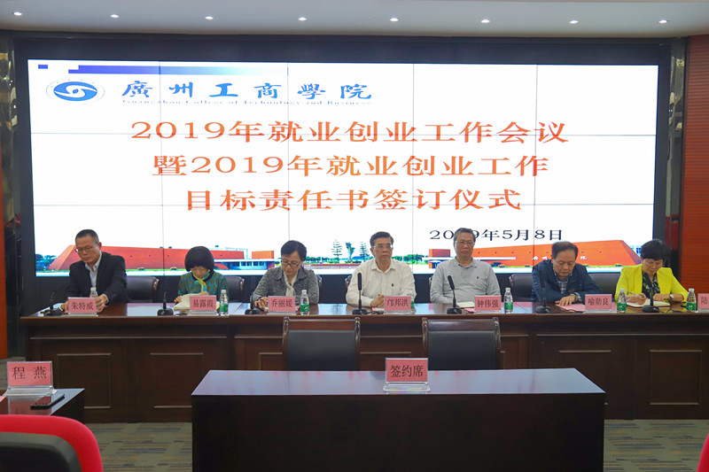 【本网讯】5月8日下午,我院2019毕业生就业创业工作会议暨就业创业工作目标责任书签订仪式在三水校区召开。学院领导班子成员、各系系主任及系办主任、2019届毕业班辅导员、就业指导中心工作人员参加。院长邝邦洪与各系系主任现场签订了《2019年毕业生就业创业工作目标责任书》。