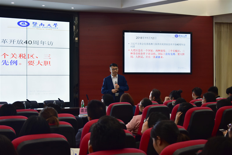 [本网讯]为深入学习贯彻习近平总书记关于粤港澳大湾区的重要指示精神,4月18日下午,学院党委特邀请广东省委宣传部经济形势宣讲团成员、暨南大学经济学院副院长刘金山教授作了主题为“新时代新湾区的新使命与新探索”的辅导讲座。讲座由学院党委副书记、学生处处长黄鹏主持,学院党务干部、师生党员以及发展对象共230余人到场聆听。