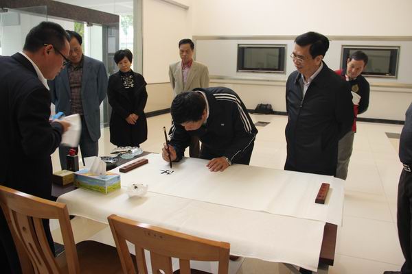 最后,考察团来到学院创业孵化基地,陈市长还专程为学院孵化基地签名,并与邵宝华董事长和邝邦洪院长一起在孵化基地前合影留念。