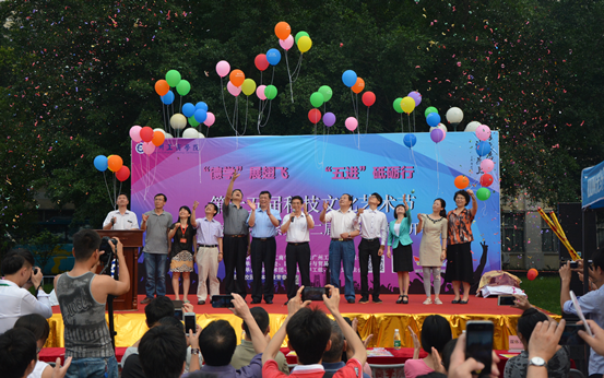 院长邝邦洪等学院领导及各系部负责人共同上台进行启动仪式。随着邝院长宣布第十五届科技文化艺术节暨经济与贸易系第十二届模拟经营节正式开幕!七彩的氦气球放飞腾空,礼炮齐鸣,师生们热烈鼓掌、尽情欢呼。