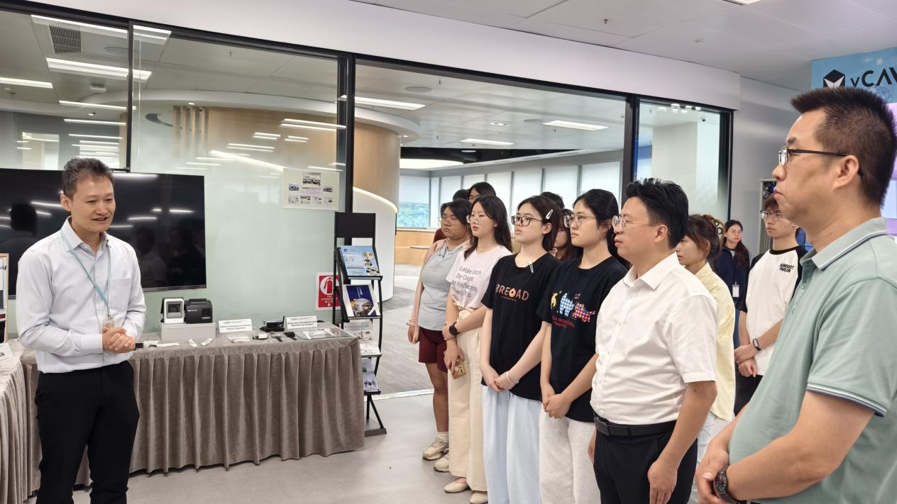 在香港理工大学和华为共建的先进计算系统与网络光互连联合实验室里,同学们领略了高性能计算系统的强大计算能力、高效能网络互连技术以及光纤传感的独特魅力。“相较于以前结构复杂成本高的铜缆,光纤传感能耗降低95%,高速低成本IM/DD是光互联技术的重点发展方向”,师从余长源教授的程博士与大家分享了光纤技术在香港地铁检测等不同领域的应用情况,让同学们了解光纤的优势及光无线通信、光纤传感的潜在价值。