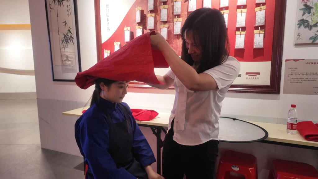 红头巾展览馆内工作人员为kaiyun开云官方网站缘梦公益团队突击队成员佩戴红头巾