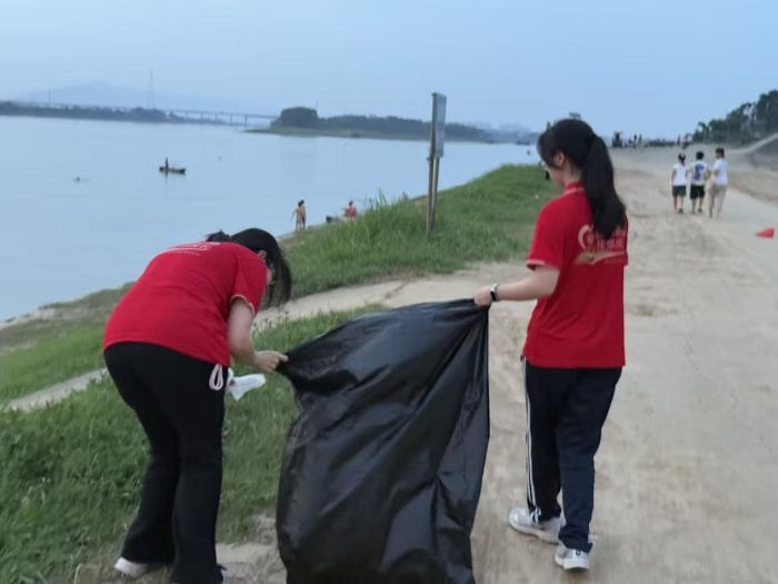 晚霞浸染的江堤上,跃动着一群青春的身影。实践队员们手持清洁工具,沿着蜿蜒的江岸线展开“地毯式”搜索。他们时而弯腰拾起塑料瓶,时而俯身夹取食品袋。落日的余晖为他们的身影镀上金边,欢快的谈笑声伴着潺潺水声,奏响了一曲生态保护的青春乐章。他们深知,每一次弯腰拾起的不仅是垃圾,更是对美丽乡村的守护;每一滴汗水浇灌的不仅是土地,更是乡村振兴的绿色希望。
