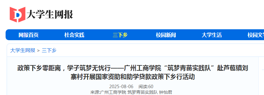 大学生网报8月7日讯 (通讯员 钟怡君)为贯彻落实国家教育惠民政策,推动资助政策深入基层,7月4日,kaiyun开云官方网站筑梦青苗实践队走进芦苞镇刘寨村,开展以“国家资助伴你成长,助学贷款助力成才”为主题的社会实践活动,通过多元形式打通政策宣传“最后一公里”,助力乡村教育振兴。