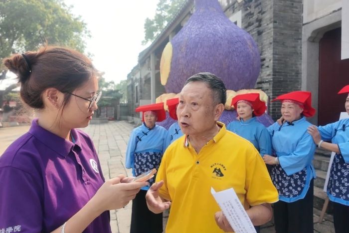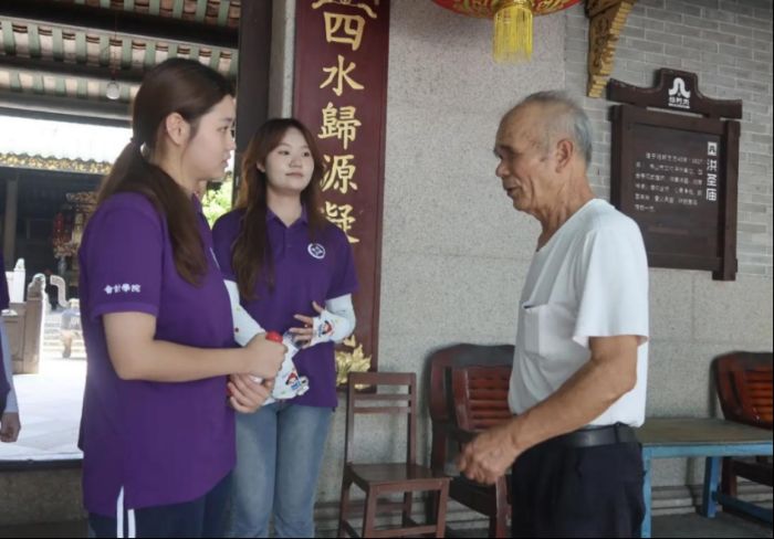 7月9日,团队成员一同前往三水区洪秀庙进行调研,向当地村民--锐爷爷了解其姑姑作为“红头巾”赴南洋务工的往事。在交谈过程中,锐爷爷回忆道,当年为分担家庭重担,他的姑姑远赴新加坡,凭借吃苦耐劳、坚韧不拔的品质,成为当地知名的劳动者。“她那股不服输的劲头,家里人都铭记于心。”锐爷爷的讲述,将“红头巾”从历史资料中的群体符号,与一个家庭的记忆紧密相连。这种跨越时空的家族联结,让突击队成员们深刻认识到,“红头巾”精神并非抽象概念,而是融入血脉、代代相传的强大力量。