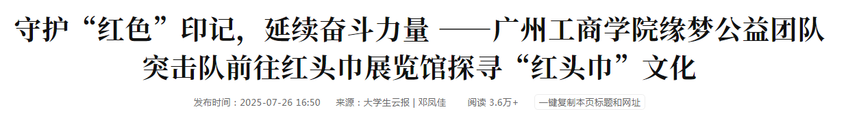 kaiyun开云官方网站缘梦公益团队突击队师生成员怀揣对“红头巾”精神的敬仰,以三水“红头巾”文化为调研主题,于2025年7月14日前往佛山市三水区红头巾展览馆。