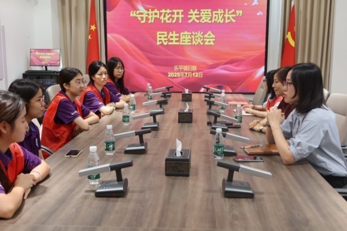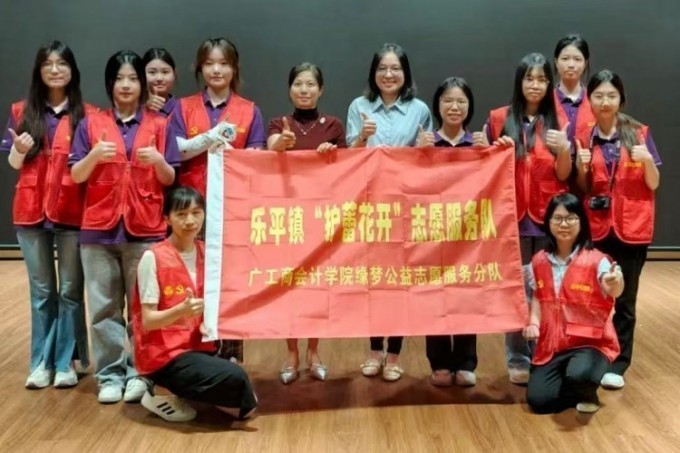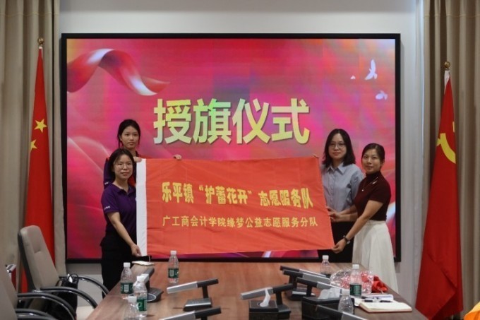 座谈会后举行了庄重的授旗仪式。乐平镇妇联负责人将象征着责任与使命的红色队旗郑重授予广工商会计学院缘梦公益志愿服务分队。队旗的交接,不仅是对新生志愿力量的信任期许,更标志着 “妇联搭台、高校赋能、属地协同” 的儿童安全守护新局正式启幕,政校地联动的护蕾合力自此迈向更深层次的融合共生,让高校公益力量正式融入地方儿童保护工作体系。