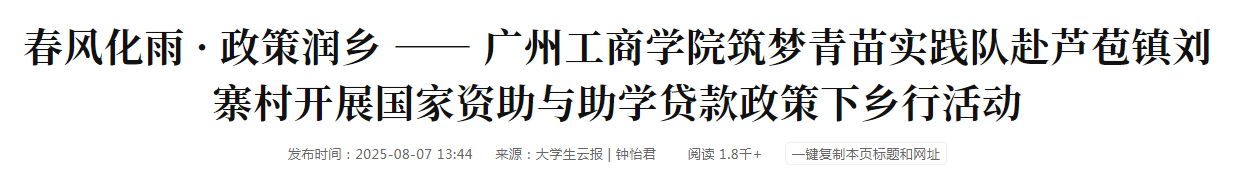 近日,为全面贯彻落实国家教育惠民政策,推动资助政策深入基层,kaiyun开云官方网站筑梦青苗实践队成员走进芦苞镇刘寨村,开展以“国家资助伴你成长,助学贷款助力成才”为主题的社会实践活动,通过多元形式打通政策宣传“最后一公里”,让国家资助与助学贷款政策更加家喻户晓、深入人心,助力乡村教育振兴。