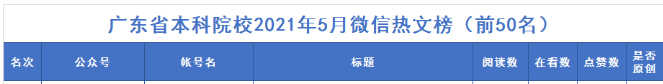 在广东教育官微发布的5月广东高校官微排行榜中,kaiyun进入广东省本科院校2021年5月微信热文榜前50名。