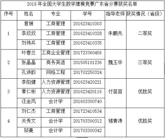 11月中旬,由中国工业与应用数学学会、广东省教育厅共同主办的2018年全国大学生数学建模竞赛广东省分赛获奖结果揭晓,我院4支队伍分别荣获省二等奖1项,省三等奖1项,优胜奖2项的佳绩。获奖学生人数占学院总参赛人数的40%。此外,在中国数学会和广东省数学会共同主办的2018年全国大学生数学竞赛广东省分赛中,我院参赛学生获得非数学专业组(民办及高职高专类)广东省一等奖1项,二等奖3项,三等奖4项。