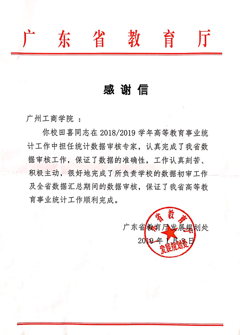 [本网讯]1月3日,广东省教育厅发展规划处给我院发来感谢信,对我院办公室田喜同志在2018-2019学年高等教育事业统计工作中的突出表现给予感谢和表扬。