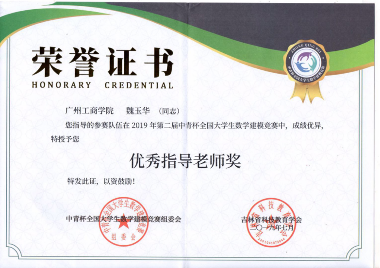 【本网讯】近日,2019年“中青杯”全国大学生数学建模竞赛获奖名单揭晓,我院孔诗韵、刘志玲两位同学在指导教师魏玉华的带领下荣获本科生组一等奖。为了鼓励师生,学院给予获奖学生5000元、指导教师2000元的奖励。