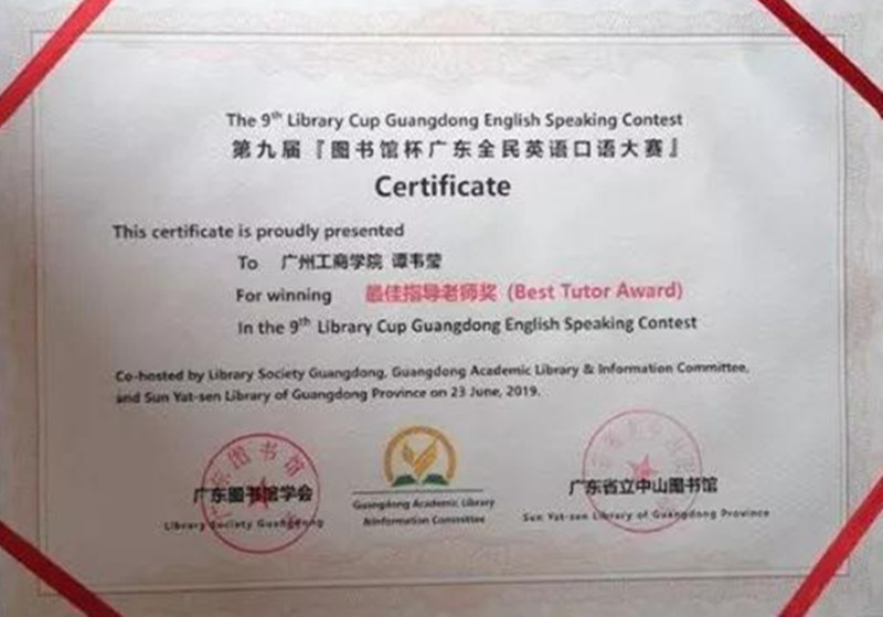 【本网讯】6月23日下午,以“为祖国喝彩• 图书馆,让世界倾听”为主题第九届“图书馆杯广东全民英语口语大赛”暨全国首届“图书馆杯全民英语口语风采展示活动”广东赛区总决赛在广东省立中山图书馆举行。我院外语系郭敏婷同学荣获第九届“图书馆杯广东全民英语口语大赛”广东赛区总决赛的二等奖;外语系指导老师谭韦莹老师获得本次比赛的“最佳指导老师”奖。