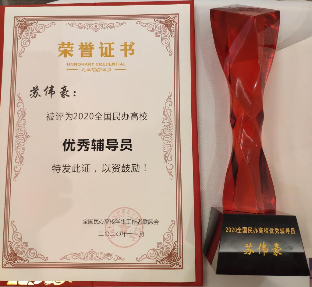 【本网讯】11月20-22日,第六届全国民办高校辅导员工作高峰论坛暨第五届全国民办高校优秀辅导员颁奖典礼在杭州隆重开幕,我系辅导员苏伟豪老师凭借良好的业务素养和突出的工作成绩荣获“2020全国民办高校优秀辅导员”荣誉称号。