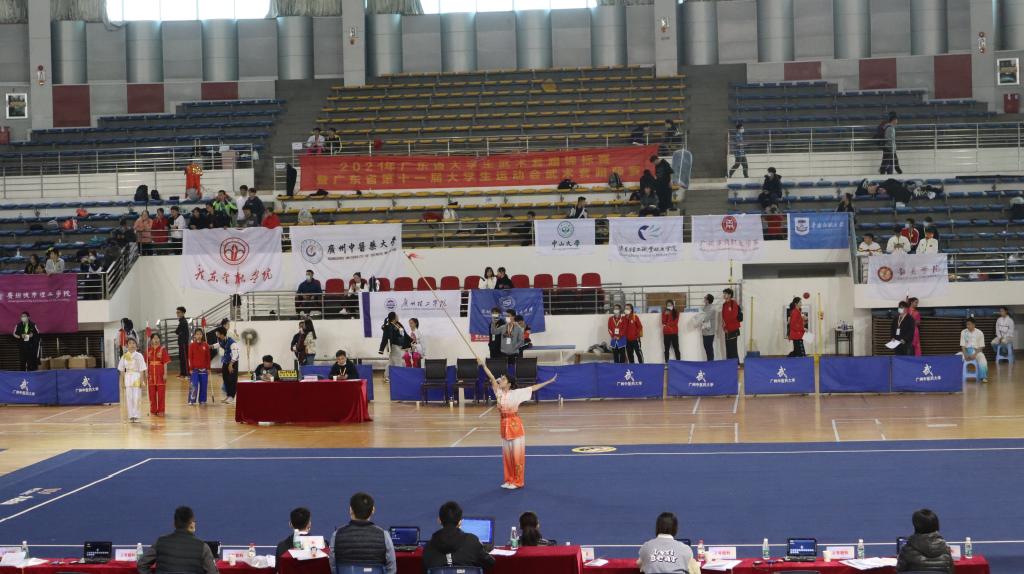 【本网讯】2021年广东省大学生武术套路锦标赛暨广东省第十一届大学生运动会武术套路预赛于12月3日-5日在广州中医药大学(大学城校区)体育馆举行。共有来自全省63所高等院校,共446余名运动员参赛。