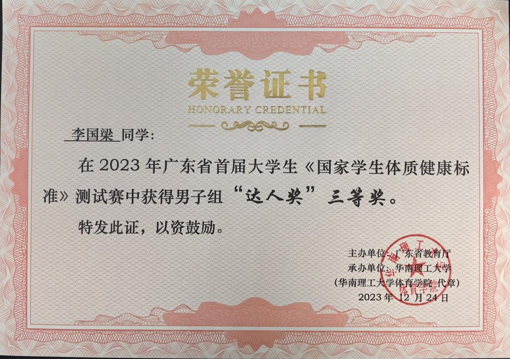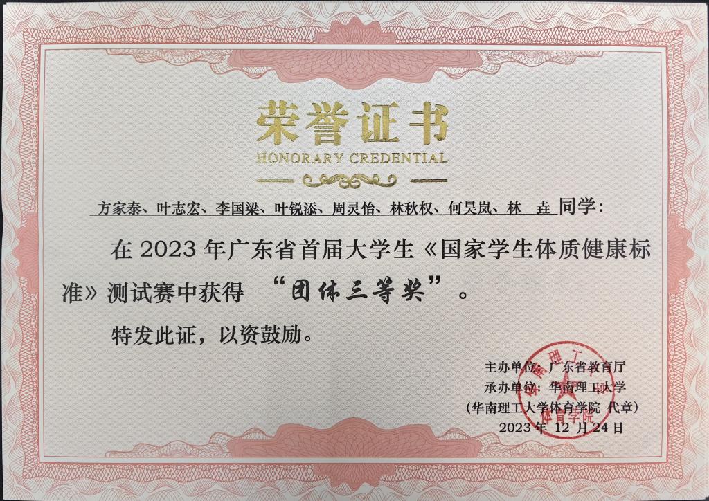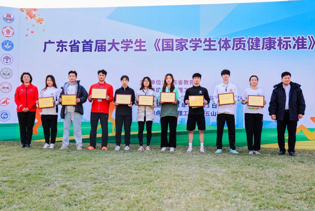 【本网讯】12月24日,广东省首届大学生《国家学生体质健康标准》测试赛在华南理工大学五山校区举行。学校工学院2022级软件工程B5班方家泰、2022级电子信息工程B1班李国梁、2022级食品B4班林秋权、2022级数字媒体B3班林垚等学生代表学校参赛。李国梁同学获“男子组达人奖”三等奖和“坐位体前屈”第三名,方家泰、李国梁、林秋权和林垚等获团体三等奖。
