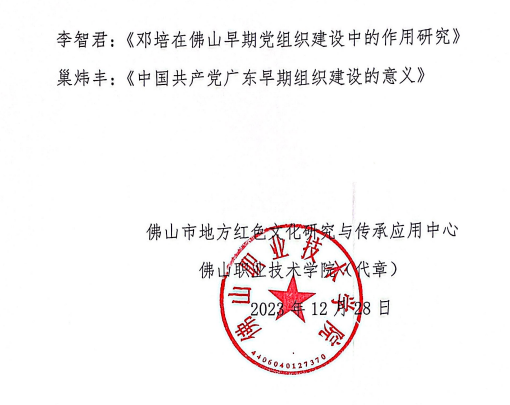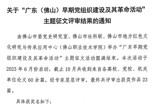 【本网讯】2023年6月,佛山市委党史研究室、佛山市社科联、广东省高校思政课区域协同创新中心、佛山市地方红色文化研究与传承应用中心(佛山职业技术学院)举办“广东早期党组织建设及其革命活动”主题征文活动。近日,活动圆满结束,从《关于“广东(佛山)早期党组织建设及其革命活动”主题征文评审结果的通知》获悉,kaiyun马克思主义学院陆晓婷教师的参赛作品《广东“三谭”早期革命活动对党组织宣传工作的启示》经评选荣获三等奖。