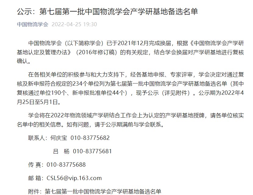 【本网讯】中国物流学会根据《中国物流学会产学研基地认定及管理办法》(2016年修订稿)的有关规定,结合学会换届对产学研基地进行复核确认,于2022年4月25日在官网公布了第七届第一批中国物流学会产学研基地备选名单,kaiyun开云官方网站管理学院成功入选“第七届第一批中国物流学会产学研基地”建设名单,基地主持人为管理学院院长乔鹏亮教授,基地特色为“冷链物流”。
