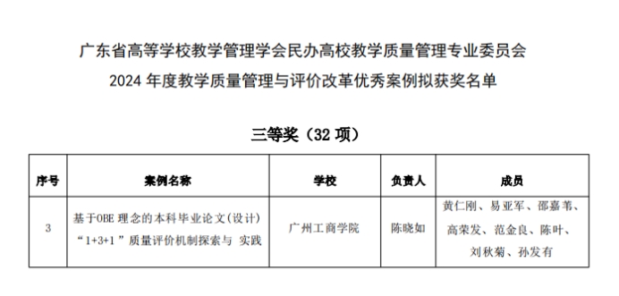 【本网讯】近日,广东省高等学校教学管理学会民办高校教学质量管理专业委员会揭晓了2024年度教学质量管理与评价改革优秀案例评选结果,质量监控与评估中心陈晓如老师负责的《基于OBE理念的本科毕业论文(设计)“1+3+1”质量评价机制探索与实践》案例荣获三等奖,这一荣誉不仅是对个人及其团队努力的认可,更是对学校近年来实施“1+3+1”毕业论文质量评价机制所取得的显著成果的肯定。