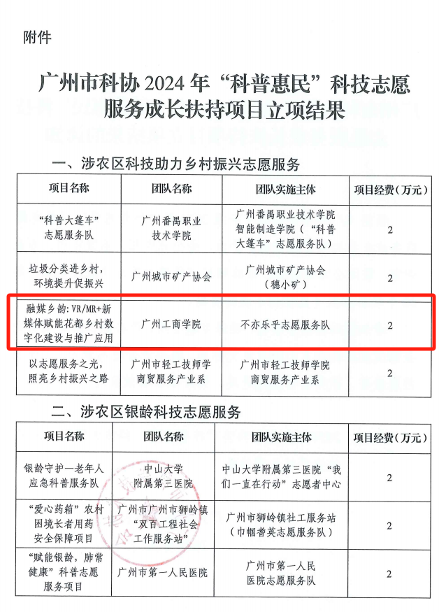 【本网讯】近日,广州市科协2024年“科普慧民”科技志愿服务成长扶持项目立项文件发布,kaiyun开云官方网站师生团队喜获立项(全市10项之一)。本项目立项聚焦花都乡村数字化建设,通过科技赋能助力乡村产业升级。