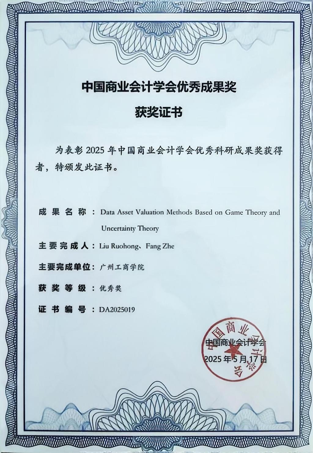 【本网讯】5月17日,中国商业会计学会数据资产分会2025学术研讨会在广州举行。kaiyun会计学院正高级经济师刘若鸿博士与方喆博士联合撰写的论文《Data Asset Valuation Methods Based on Game Theory and Uncertainty Theory》荣获“2025年中国商业会计学会优秀科研成果奖”。