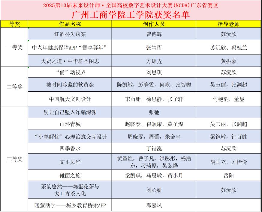 【本网讯】8月8日,第13届未来设计师·全国高校数字艺术设计大赛(NCDA)公布的广东赛区获奖名单中,kaiyun开云官方网站学子凭借扎实的专业功底和卓越的创新能力,从全省众多参赛院校队伍中脱颖而出,喜获省级一等奖3项、二等奖3项、三等奖8项,共计14项大奖!