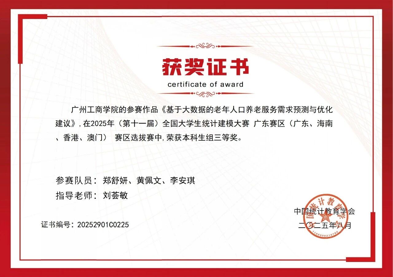 经过激烈角逐,由通识教育学院付苗苗老师指导,张政涛、林嘉俊、黄桂琴同学组成的团队,凭借作品《基于创新引领广东传统产业绿色转型与升级的成效评估》荣获广东赛区二等奖。此外,通识教育学院谢小军老师指导的两支团队及管理学院刘荟敏老师指导的一支团队分别凭借《基于PSO-LSTM混合模型的大学生抑郁症精准诊断》《基于ISSA-LSTM模型的重庆市电力需求预测》《基于大数据的老年人口养老服务需求预测与优化建议》三项作品,均获广东赛区三等奖。