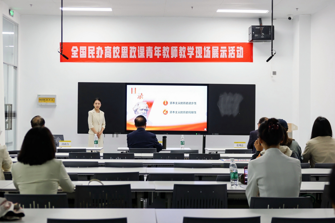 本次大赛聚焦思政课的教学创新与质量提升,旨在为全国民办高校思政课教师搭建交流学习、互鉴共进的平台。大赛分为网络评审、现场教学展示两个环节,要求参赛者以现行高校思想政治理论课教材为依据,选取教学内容进行教学设计与教学展示,全面考察教师的理论阐释能力、教学设计能力与课堂驾驭能力。在现场教学展示中,张丽薇老师以《辩证看待资本主义的历史地位》为题参加《马克思主义基本原理》课程教学展示活动,她从资本主义的历史进步性与局限性两个方面,以马克思主义理论经典论述为依托,凭借清晰的逻辑框架、富有感染力的语言表达,生动呈现了一堂兼具思想性、趣味性与启发性的思政课,赢得了评委们的一致好评。